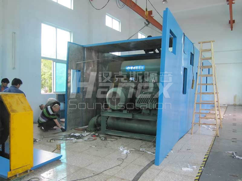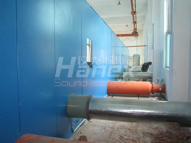 案例簡介:廠內有5臺羅茨鼓風機,單臺風機功率為132Kw,5000m3/hr,運行時噪聲值在105dB(A)以上。治理后,在隔聲罩1米處噪聲值小于85dB(A),達到規定值。