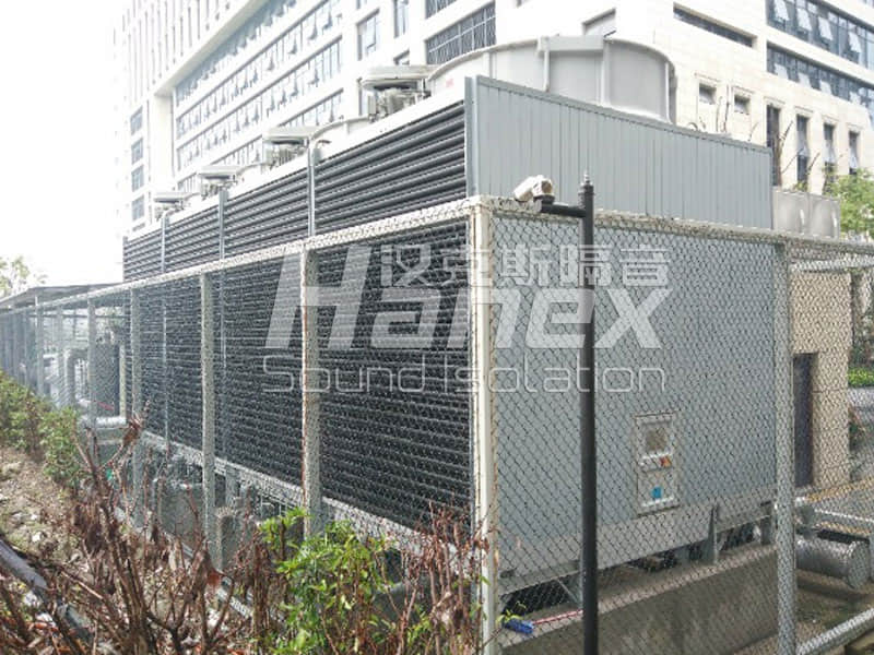 在冷卻塔四周一定的距離整體設置隔音屏障,隔音屏障底部鏤空,底部鏤空高度不少于1.2m。由于東面距離住宅樓原,且存在消聲器遮擋等作用,其鏤空高度可以更高。東面封死。