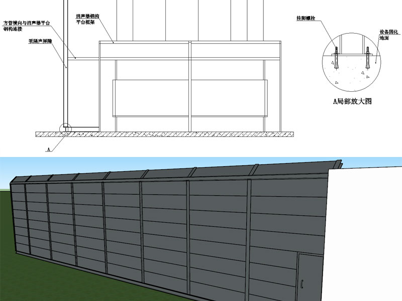 5、吸隔聲屏障立柱采用HW125型鋼,底部找平基礎采用HW150型鋼,立柱底部與型鋼基礎進行焊接,立柱間距2.5米,型鋼基礎底部預埋螺栓與設備固化地面進行連接,底部與設備基礎進行橫向連接,同時為增加其抗風性能,吸隔聲屏障中部與排風消聲器平臺進行橫向連接。